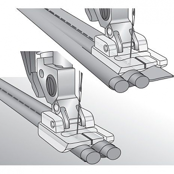 3. Уложить под лапку оба шнура, чтобы они находились слева от иглы (правый шнур проходил через левый желобок лапки), а припуски на швы – справа от иглы.