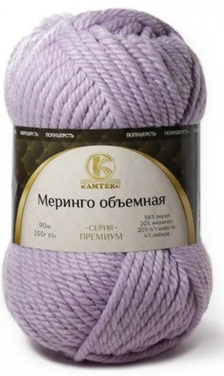 Марка - Меринго объемная; Состав - 56% акрил, 20% меринос, 20% шерсть, 4% лайкра; Цвет - лаванда; Вес, г - 150; Длина намотки, м - 90; Производитель - Россия;
